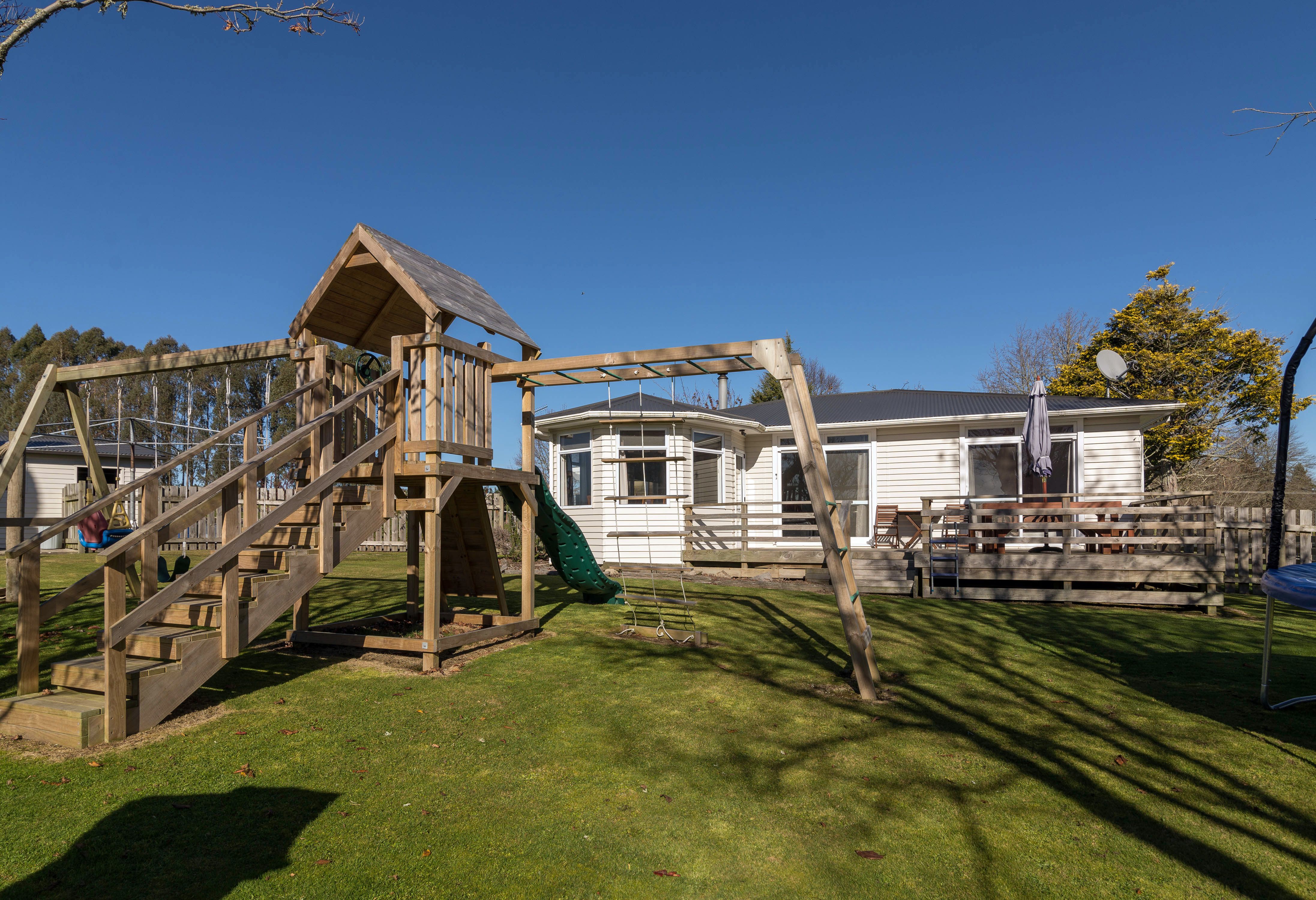 Heading out doors this property has 8 paddocks, chicken coop, a small 2 bay calving shed, raised garden beds, a gravity fed water tank as backup and double garaging plus the children's sand pit and playground.